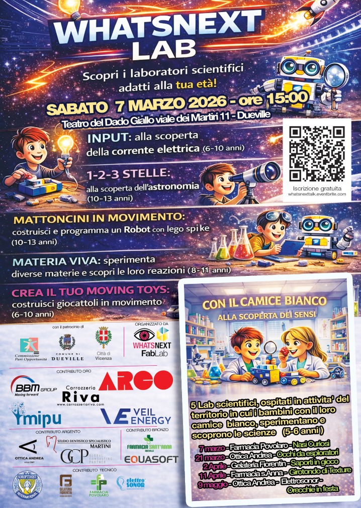 Nell'ambito dell'iniziative per l'8 marzo Giornata internazionale della donna l'associazione Whastnext Fablba propone un pomeriggio di laboratori scientifici dedicati a bambine/i di varie fasce d'età ( dai 6 ai 13 anni) ed il racconto avvincente di 5 ragazze che, partendo come riferimento da Vicenza e dal Veneto, hanno avviato progetti e ottenuto rilevanti riscontri professionali nell'ambito dell'innovazione. con richiesta di caricamento sul registro elettronico Nuvola.